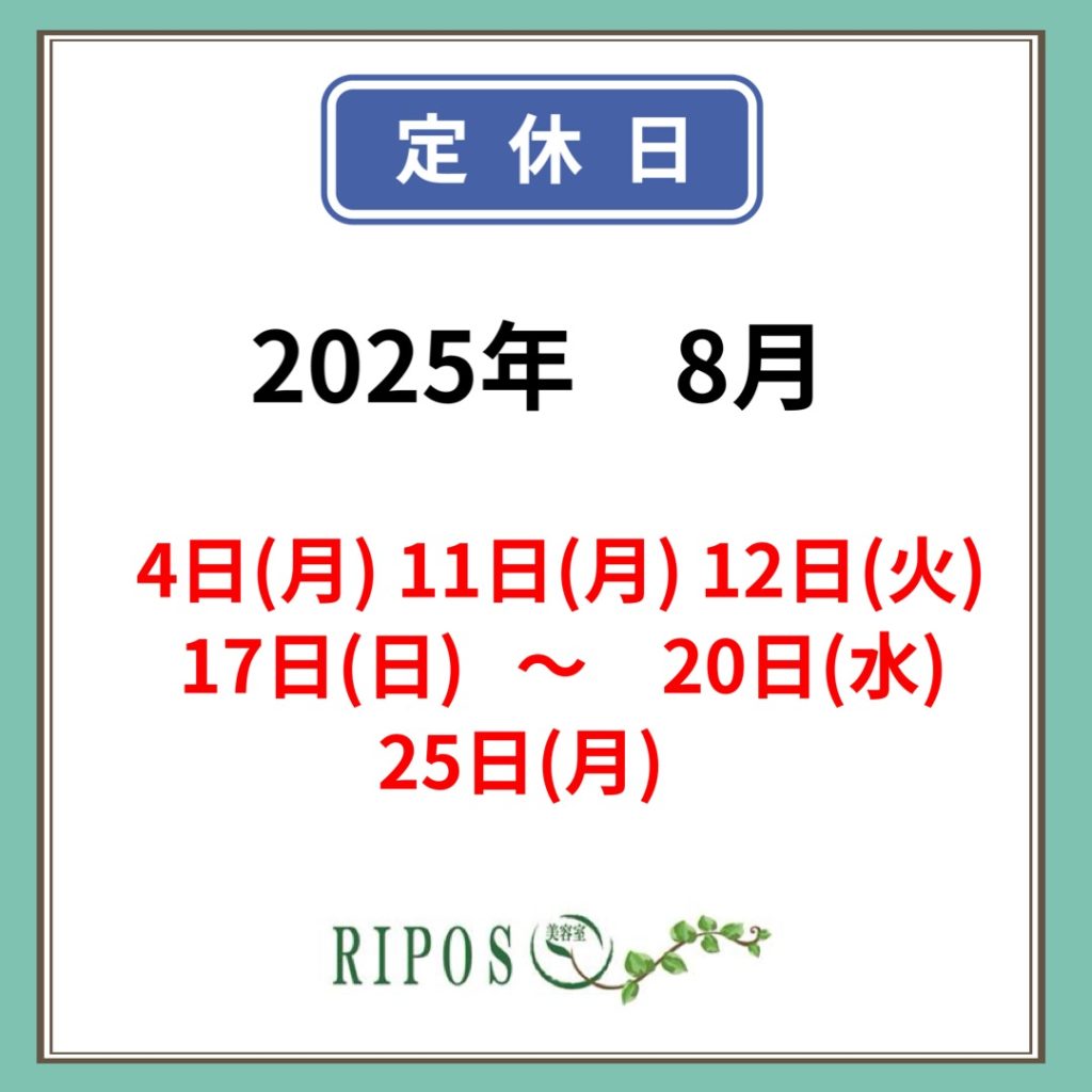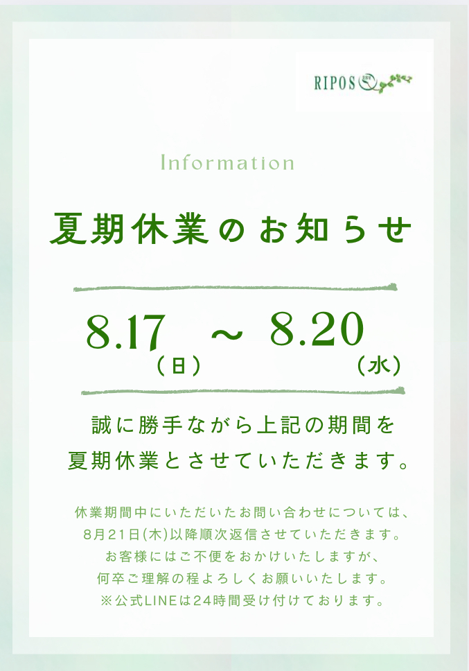 2025年8月 定休日・夏期休業お知らせby RIPOSO2025年8月1日 休業期間中も公式LINEは受付ています。 毎週月曜日・第二火曜日・第三日曜日 夏期休業 8月17日(日) ~ 20日(水) 休業中のお問い合わせは公式LINEへお願いいたします。最初にお名前(フルネーム)をお知らせください。お名前の確認がとれましたら、お問い合わせの内容をお伺いさせていただきます。 休業期間中にいただいたお問い合わせにつきましては、21日(木)以降に順次ご返信いたします。ご不便をおかけしますが、よろしくお願いいたします。 コメントを残す コメントをキャンセルメールアドレスが公開されることはありません。 ※ が付いている欄は必須項目です名前 ※ メール ※ サイト コメント ※ 次回のコメントで使用するためブラウザーに自分の名前、メールアドレス、サイトを保存する。 Δ